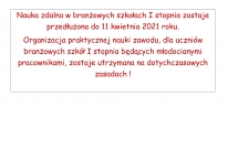 Informujemy, że uczniowie naszej szkoły uczęszczają na zajęcia praktyczne na dotychczasowych warunkach, natomiast nauka zdalna w szkole zostaje wydłużona do dnia 11.04.2021 roku!